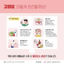 - 식단 관리: 🥗 DASH(Dietary Approaches to Stop Hypertension) 식단을 참고하여 건강한 식습관을 유지하세요. 과일, 채소, 통곡물, 저지방 유제품 섭취를 늘리고, 짠 음식, 기름진 음식, 가공식품은 최대한 피하는 것이 좋습니다.