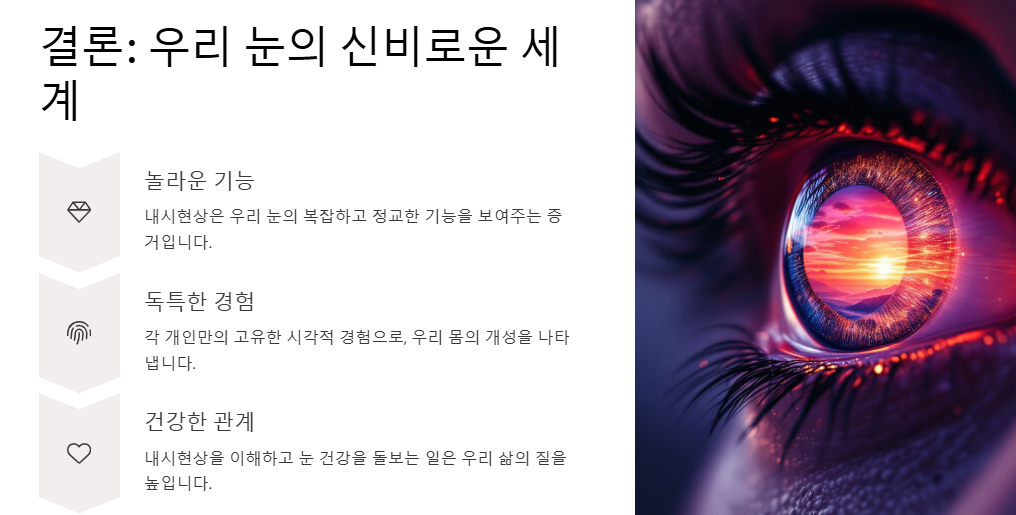 대부분의 내시현상은 정상적인 생리적 현상으로, 시간이 지나면서 익숙해지거나 자연스럽게 사라지는 경우가 많답니다. 하지만! ⚠️ 드물게 망막 질환이나 안구 손상의 신호일 수도 있으니, 평소와 뭔가 다른 이상 증상이 계속되거나 갑자기 확! 심해진다면, 반드시 안과 검사를 받아 정확한 진단을 받는 것이 현명합니다! 👍