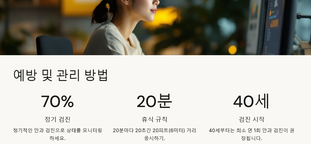 - 정기적인 안과 검진: 40대 이후에는 1년에 1~2회 정기적인 안과 검진을 받는 것이 좋습니다.