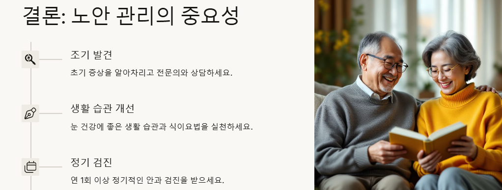 - 정기적인 안과 검진은 노안뿐만 아니라 다양한 안과 질환을 조기에 발견하고 치료하는 데 중요합니다.