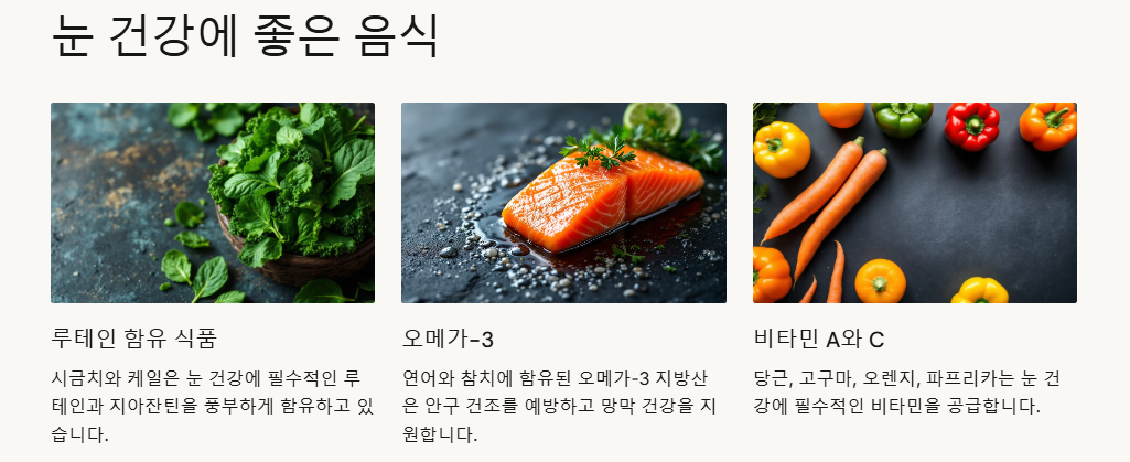 - 오메가-3 지방산: 연어, 참치 등 등푸른 생선이 풍부합니다. 안구 건조증 완화에 도움을 줍니다.