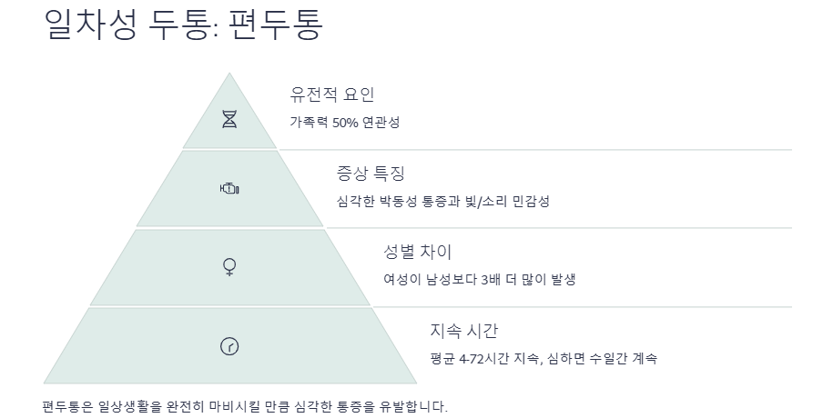정의: 주로 한쪽 머리에 나타나는 박동성(욱신거리는) 통증으로, 다양한 동반 증상을 동반하는 경우가 많습니다.