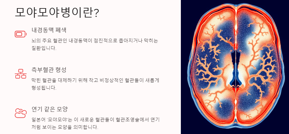 모야모야병은 뇌의 주요 혈관인 내경동맥이 좁아지거나 막히면서 대체 혈류를 형성하기 위해 비정상적인 작은 혈관들이 발달하는 질환입니다. 이 혈관들이 뇌혈관 조영술에서 연기처럼 보인다고 하여 일본어로 "모야모야(연기)"라는 이름이 붙었습니다.
