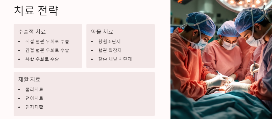 - 간접 혈관 문합술: 두피나 근육 조직을 뇌 표면에 이식하여 신생 혈관 형성을 유도합니다.