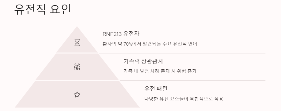 - 유전적 요인: RNF213 유전자 변이가 환자의 약 70%에서 발견되며, 가족력이 있는 경우 발병 위험이 높아집니다.