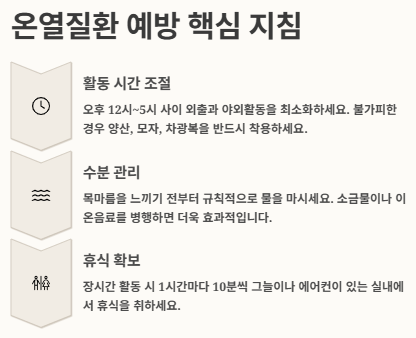 - 최고 온도(오후 12~5시)에 외출/야외활동은 최소화. 필수라면 양산·모자·차광복 착용! 🧢🌂
