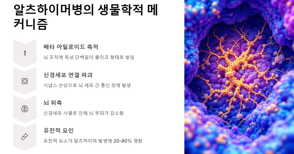- 알츠하이머병: 뇌의 신경세포가 서서히 쇠퇴하여 기억력 저하와 인지 기능 장애를 초래합니다.
