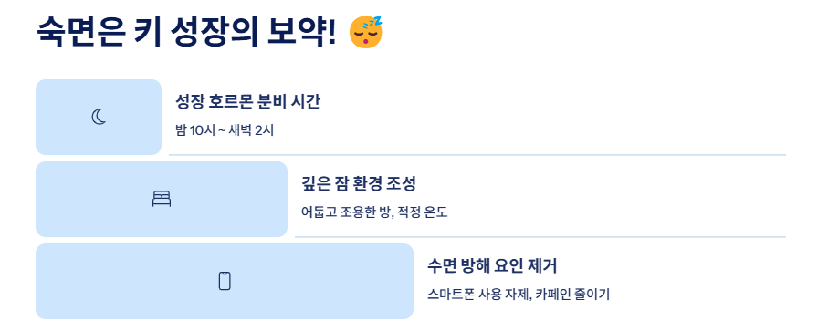 - 성장호르몬은 밤 10시~새벽 2시 사이, 깊은 수면(서파수면)에서 가장 활발히 분비됩니다.