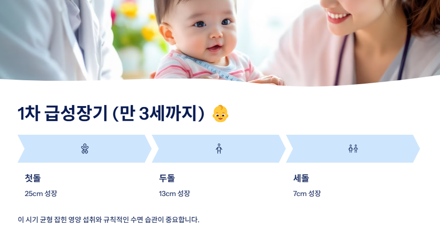 | 1차 급성장기 | 만 3세까지 첫돌까지 25cm, 두돌까지 13cm, 세돌까지 7cm 성장 |
