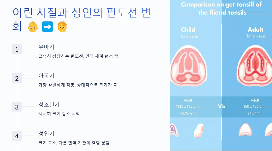 어린 시절에는 편도선이 비교적 크고 활발히 작동하지만, 성인이 되면서 점차 크기가 줄어드는 경향이 있습니다. 이는 성장 과정에서 면역 체계가 발달하며 다른 면역 기관들이 역할을 대신하기 때문입니다.