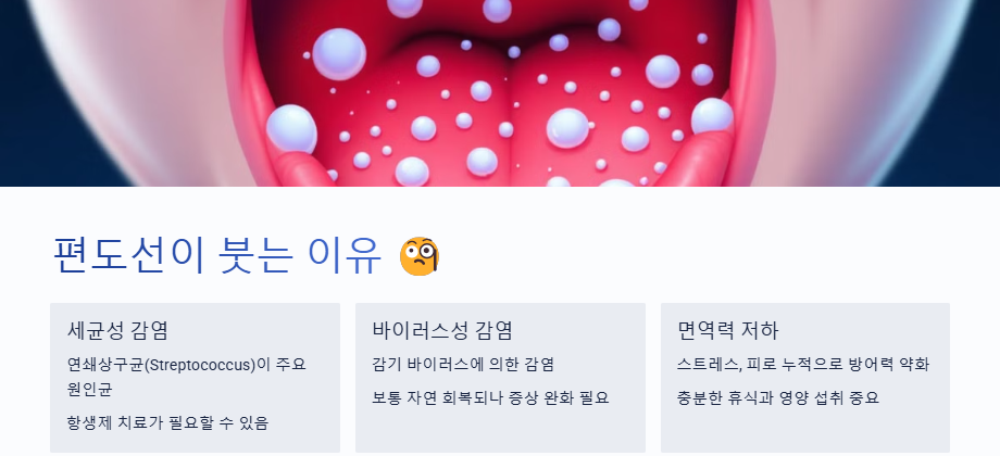 편도선이 붓는 원인은 다양하며, 주로 감염과 면역력 저하가 주요 요인으로 작용합니다. 아래에서 자세히 알아보겠습니다: