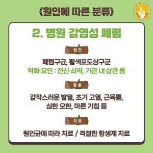 - 세균성 폐렴: 가장 흔한 형태로, 폐렴구균, 포도상구균 등이 주요 원인입니다.