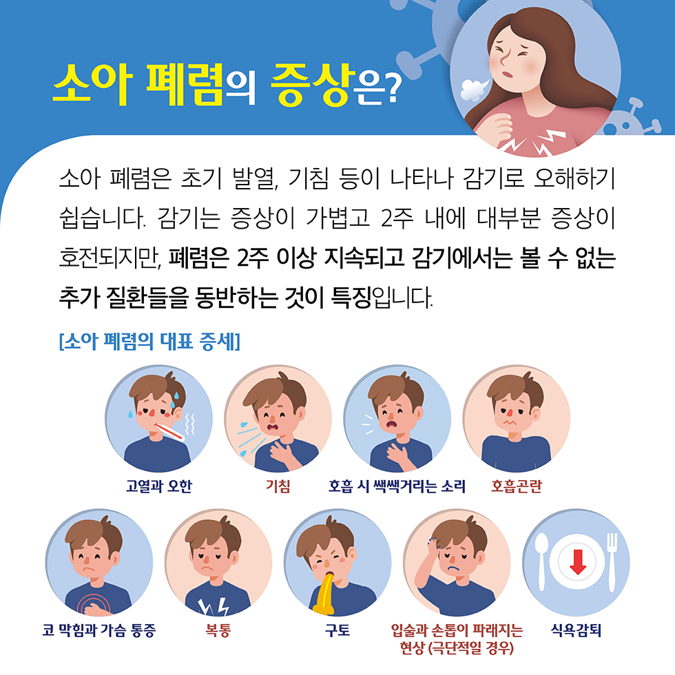 - 폐렴 증상은 고열, 기침, 호흡곤란 등이 있으며, 감기와 구별해야 합니다.