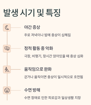 - 다리(간혹 팔, 몸통 포함)에 설명하기 어려운 불편감, 저림, 근질거림, 벌레가 기어가는 듯한 느낌 🐛
