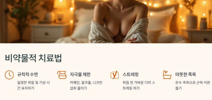 - 수면 전 족욕, 따뜻한 샤워, 다리 마사지로 근육을 이완하세요.