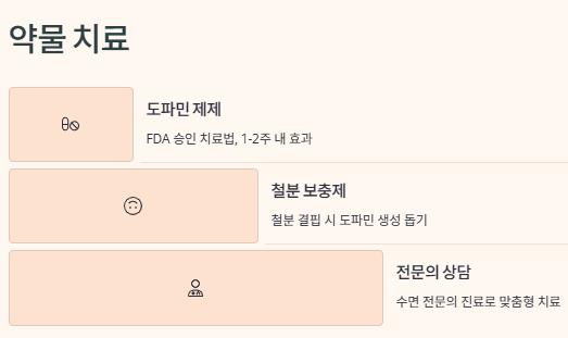 | 철분 부족 | 뇌의 철분 농도 저하가 도파민 기능 이상을 유발, 증상 악화 🥩 |