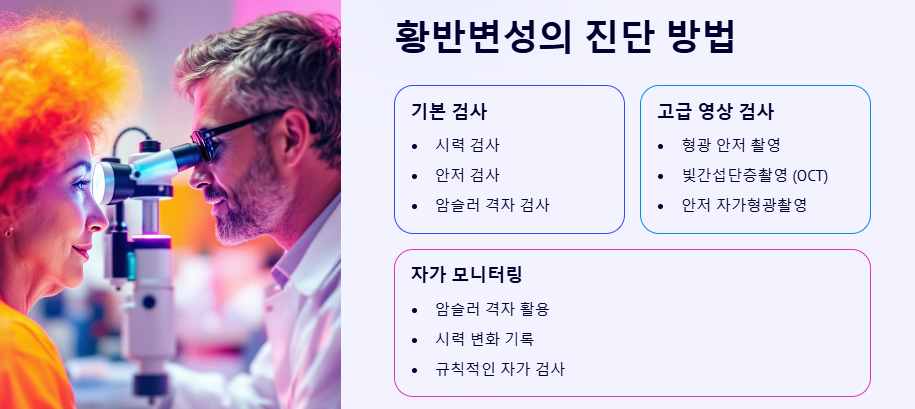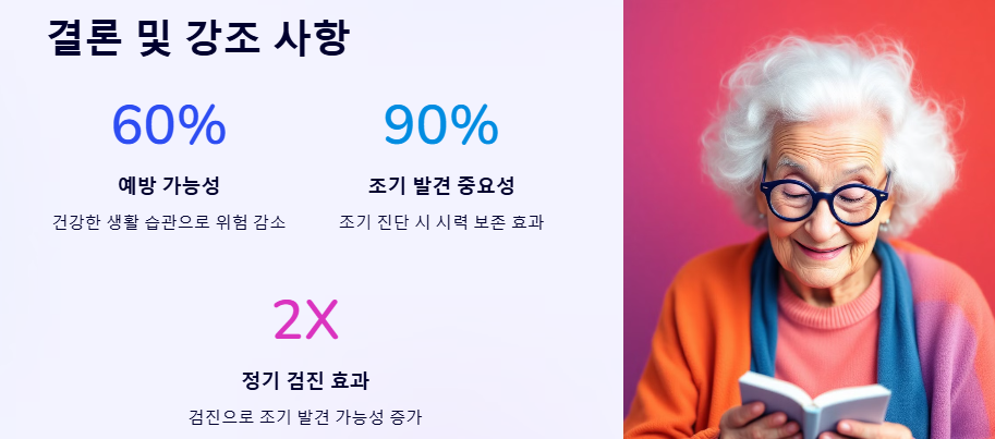 황반변성은 실명을 초래할 수 있는 심각한 질환이지만, 조기 발견과 적절한 관리로 진행을 늦출 수 있습니다. 정기적인 검진과 건강한 생활습관을 통해 눈 건강을 지키시길 바랍니다!